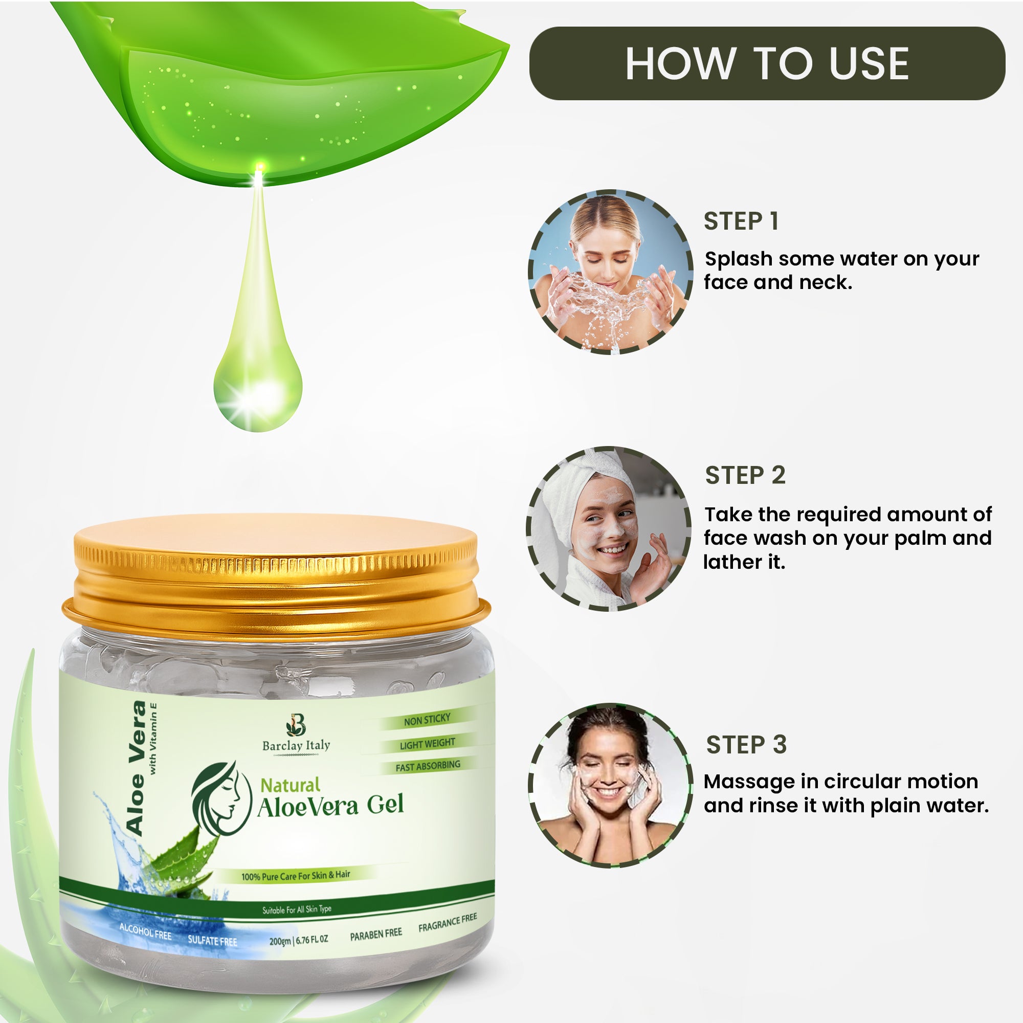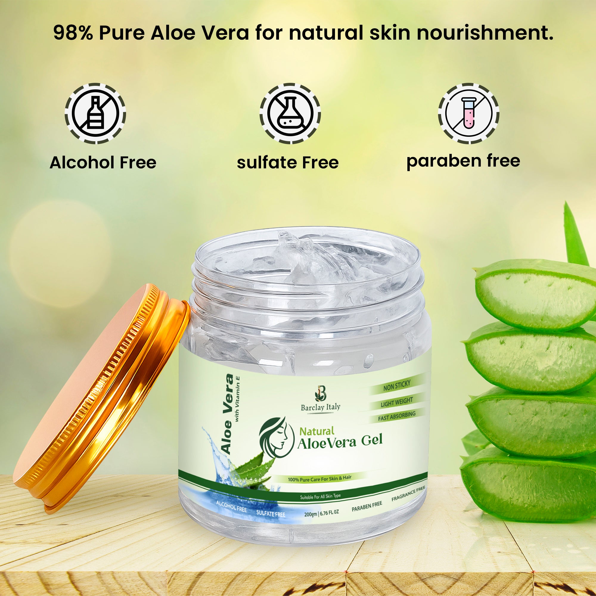 Barclay Italy's 98% Pure Aloe Vera Gel with Vitamin E is a top-rated, multi-use skincare and hair care essential that helps with everything from acne and pimples to sunburns, dandruff, dryness, and beard grooming. This non-sticky, fast-absorbing gel is made for both men and women and is suitable for all skin and hair types.